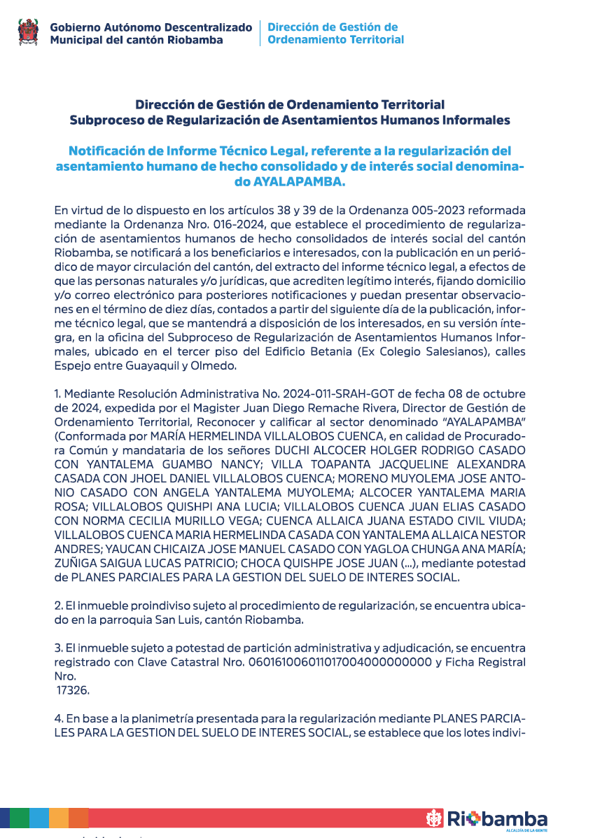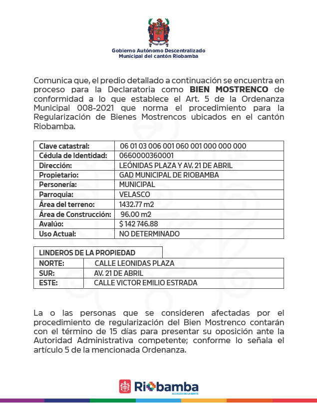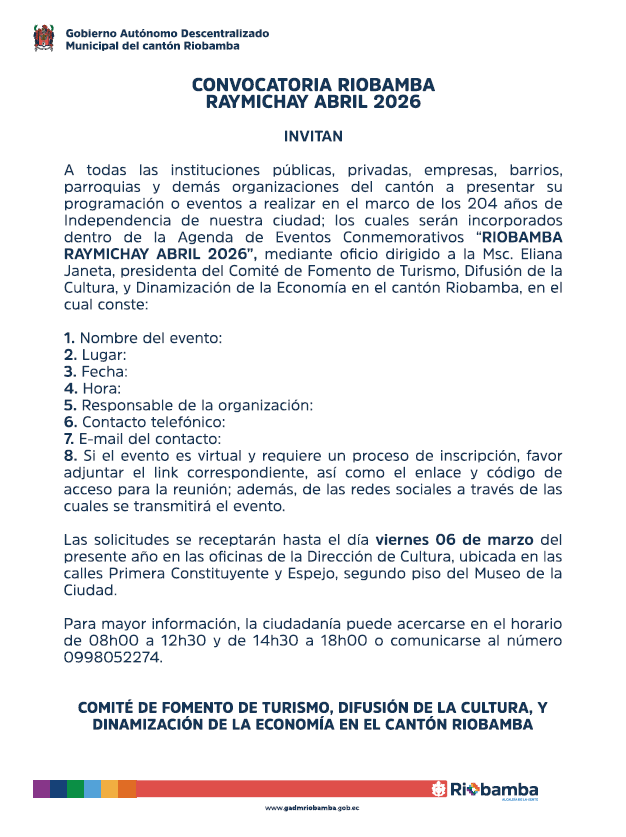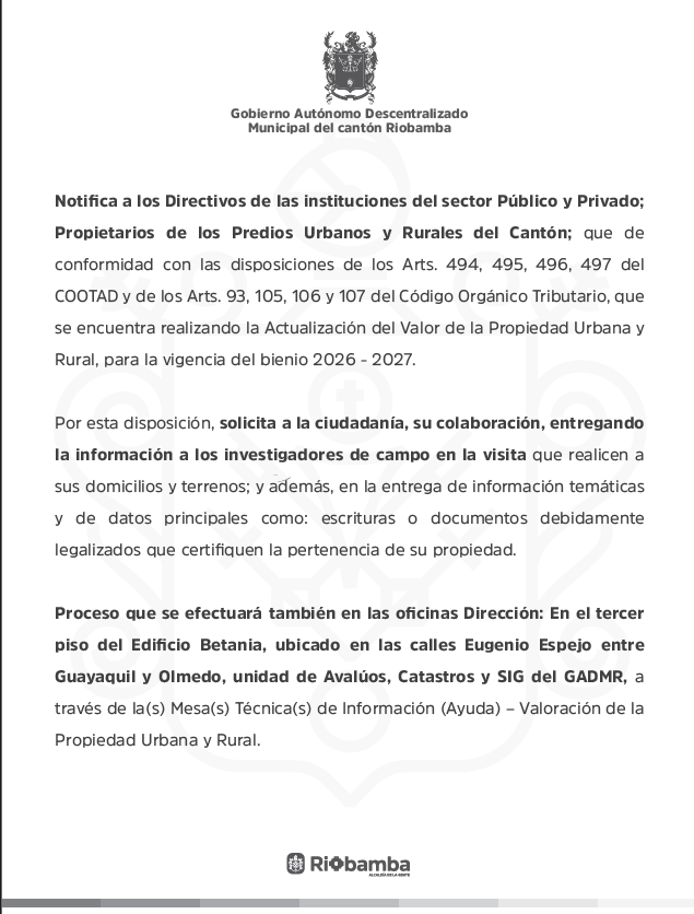 El Municipio de Riobamba, a través de la Dirección de Gestión de Patrimonio,...