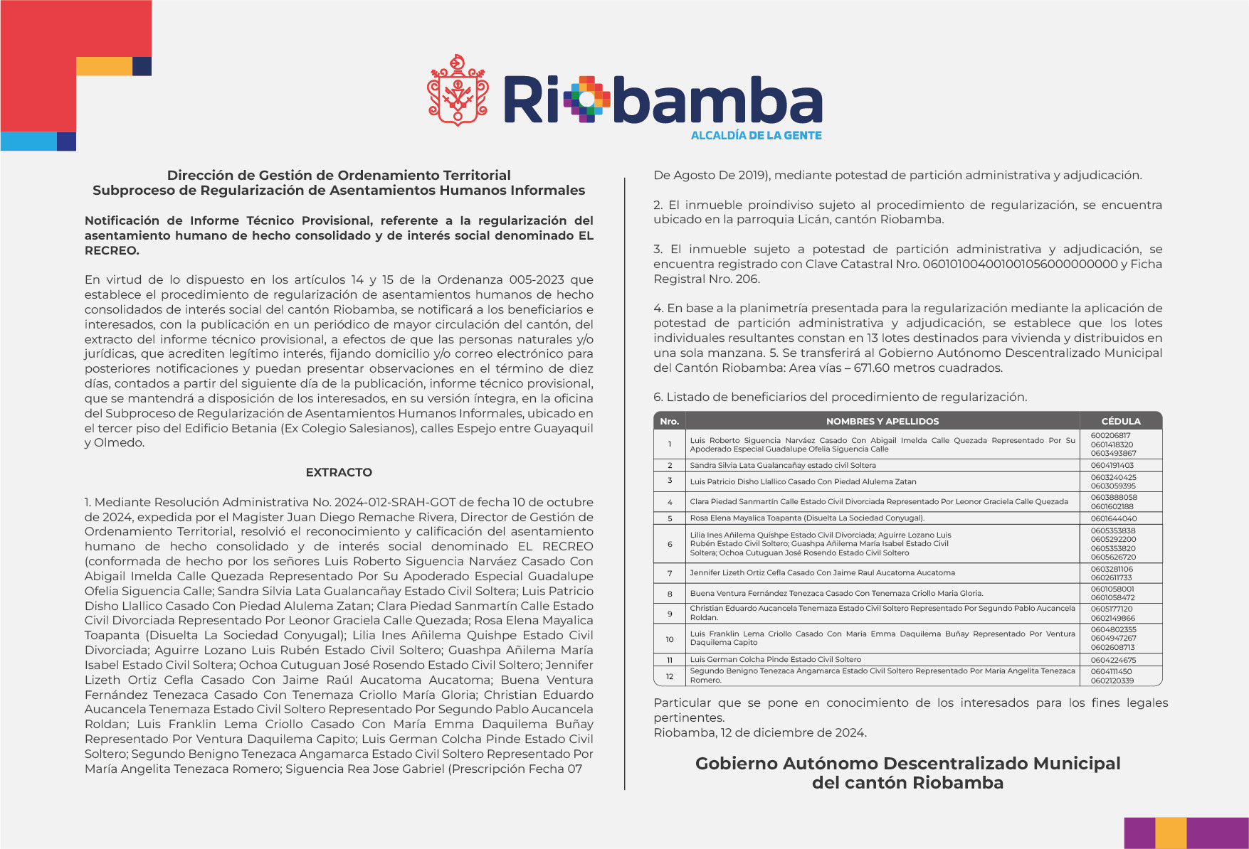 RESOLUCIÓN ADMINISTRATIVA NRO. GADMR-GPL-AP-2024-002 - APERTURA VIAL DE LA CALLE INOMINADA DESDE LA AV. ALFONSO CHAVÉZ Y LA CALLE TEI