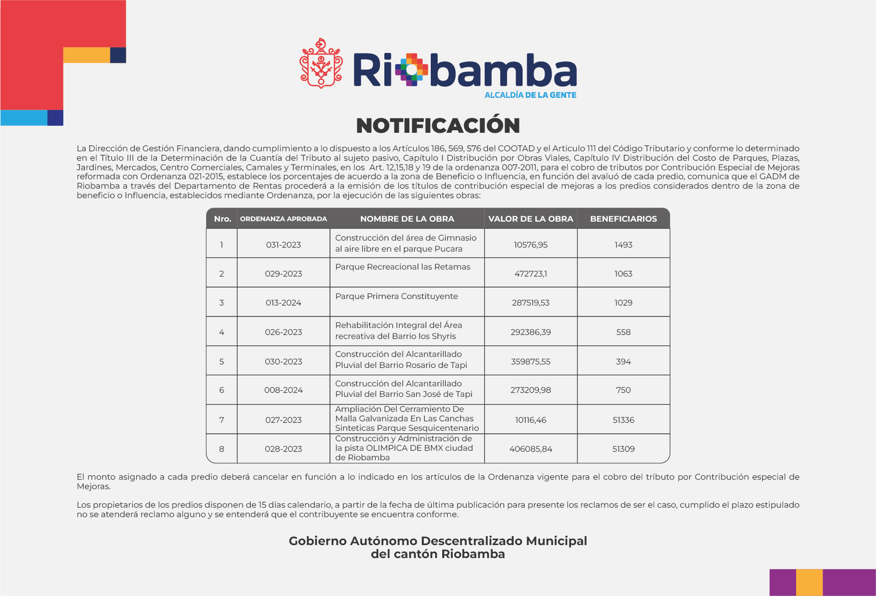 NOTIFICACIÓN - Contribución en obras