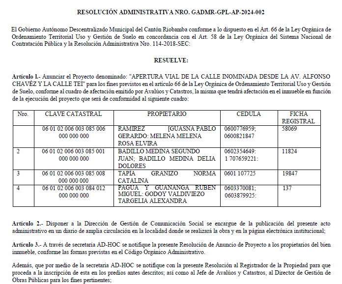 Resolución Administrativa GADMR-GPL-AP-2024-002 - Apertura Vial