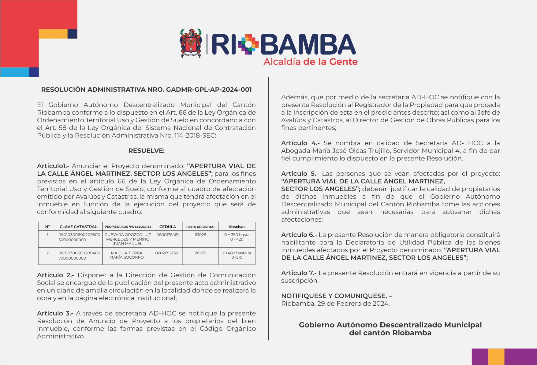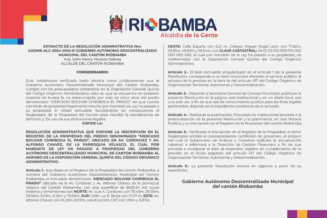 Resolución Administrativa "Mercado Bolívar Chiriboga El Prado"