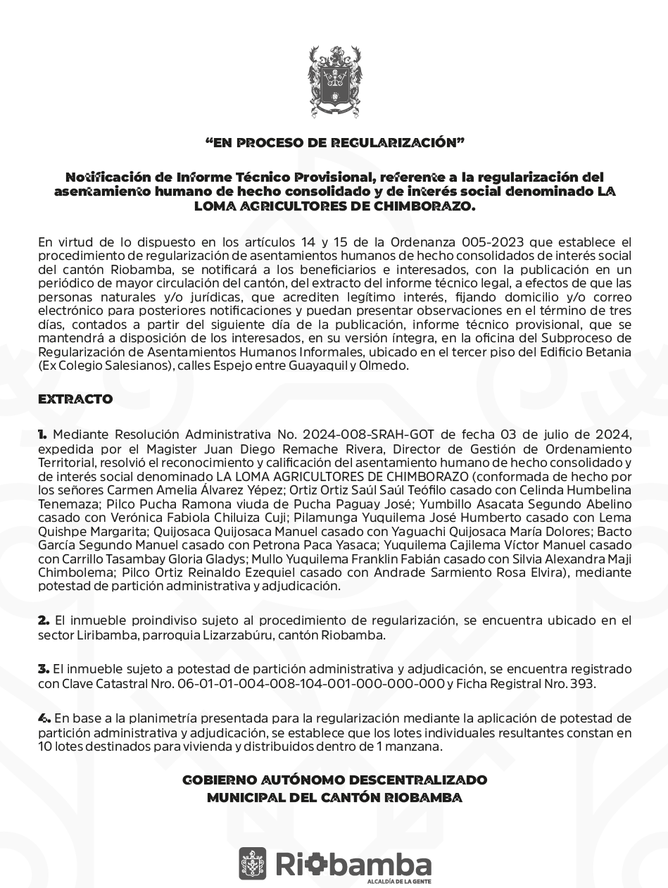 NOTIFICACIÓN - Informe Técnico Provisional a la regulación de asentamiento humano