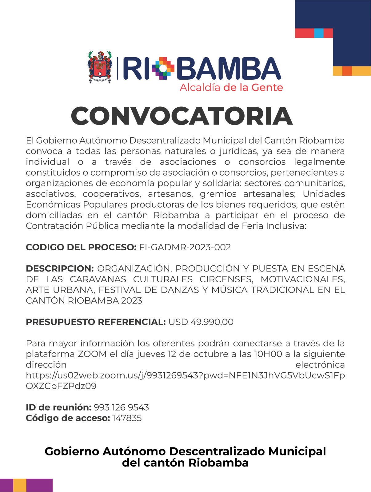 Convocatoria de organización, producción y puesta en escena de las carvanas culturales circenses, motivacionales, arte urbana, festival de danzas y música tradicional en el cantón Riobamba 2023