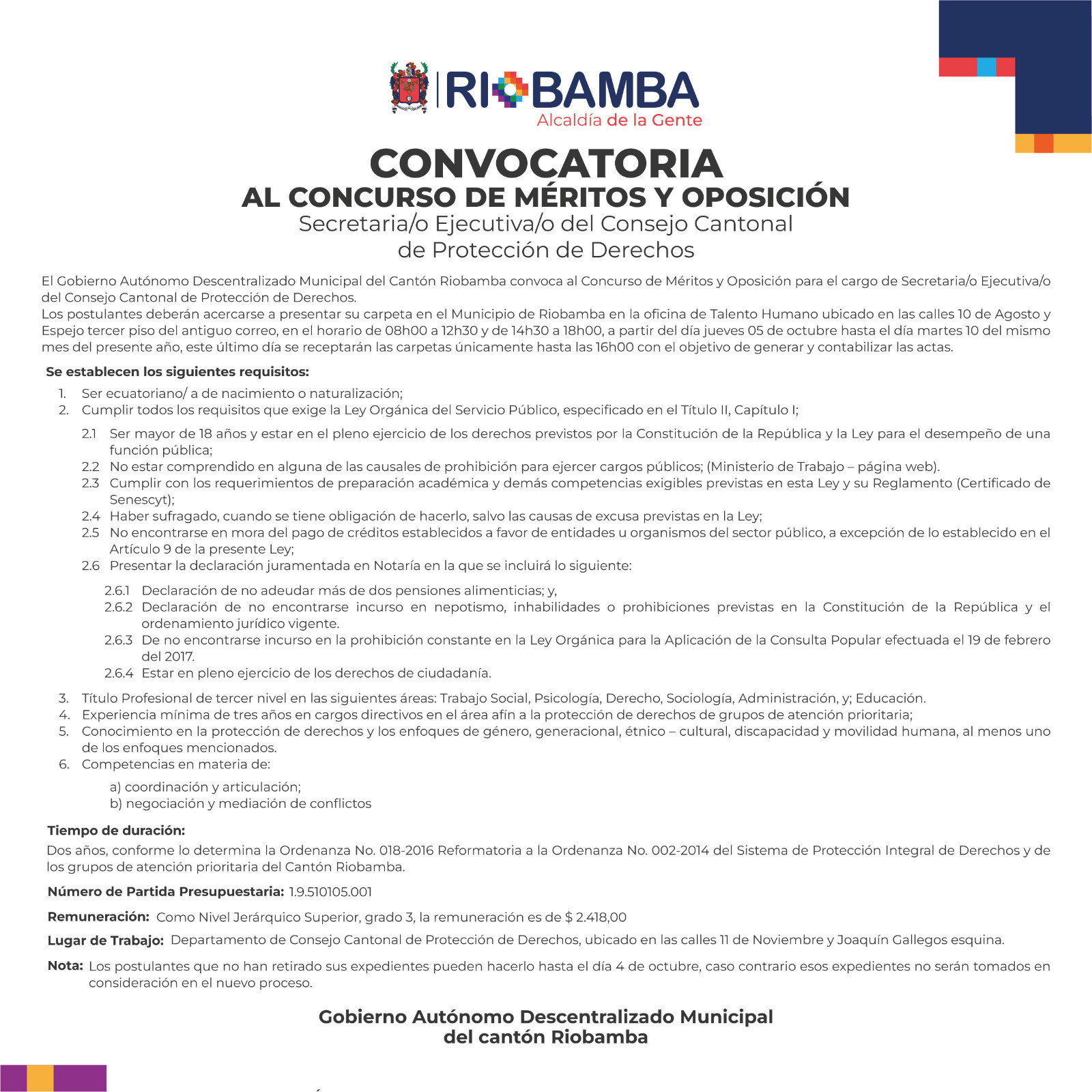 Concurso Secretaria/o Ejecutiva/o del Consejo Cantonal de Protección de Derechos 2023