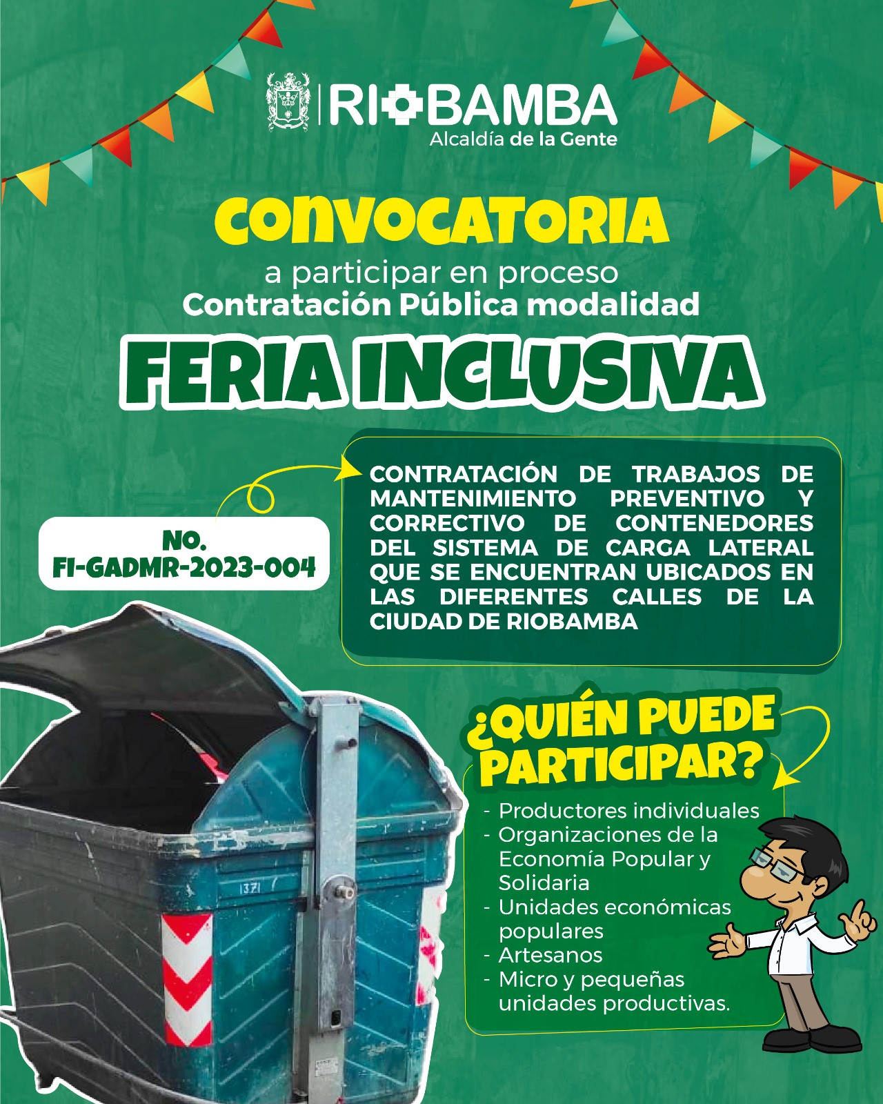 ARBI-GADMR-2023-003, CONTRATACION DE TRABAJO DE MANTENIMIENTO PREVENTIVO Y CORRECTIVO DE CONTENEDORES DEL SISTEMA DE CARGA LATERAL QUE SE ENCUENTRAN UBICADOS EN LAS DIFERENTES CALES DE LA CIUDAD DE RIOBAMBA.