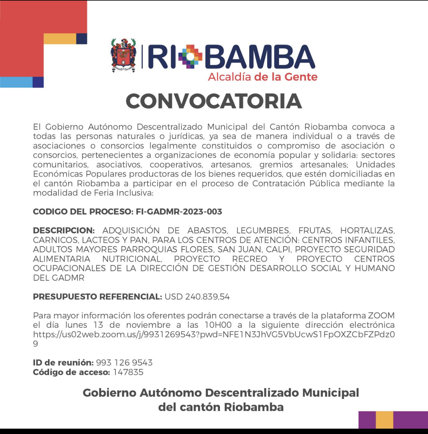 FI-GADMR-2023-003 DESCRIPCION: ADQUISICIÓN DE ABASTOS, LEGUMBRES, FRUTAS, HORTALIZAS, CARNICOS, LACTEOS Y PAN, PARA LOS CENTROS DE ATENCIÓN: CENTROS INFANTILES, ADULTOS MAYORES PARROQUIAS FLORES, SAN JUAN, CALPI, PROYECTO SEGURIDAD ALIMENTARIA NU