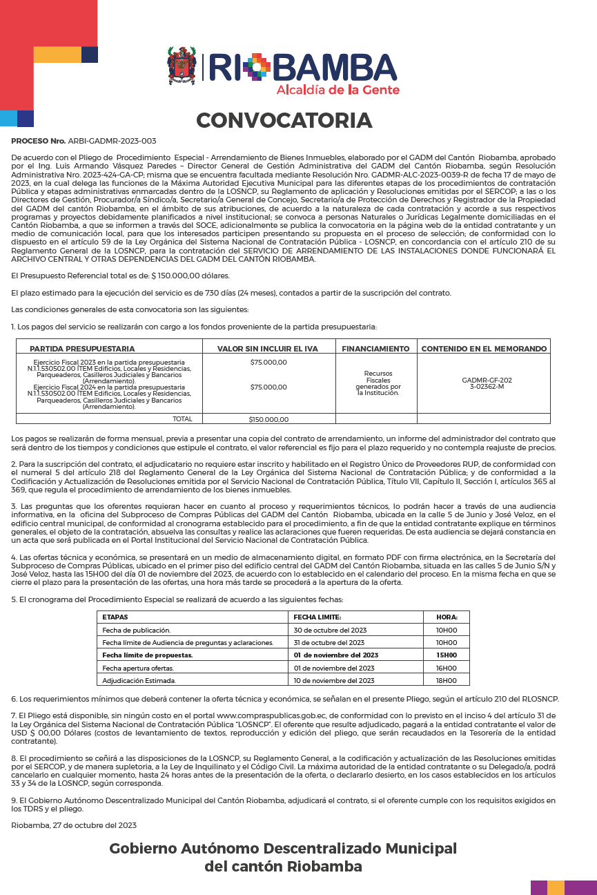 ARBI-GADMR-2023-003 - SERVICIOS DE ARRENDAMIENTO DE LAS INSTALACIONES DONDE FUNCIONARA EL ARCHIVO CENTRAL Y OTRAS DEPENDENCIAS DEL GADM DEL CANTÓN RIOBAMBA.